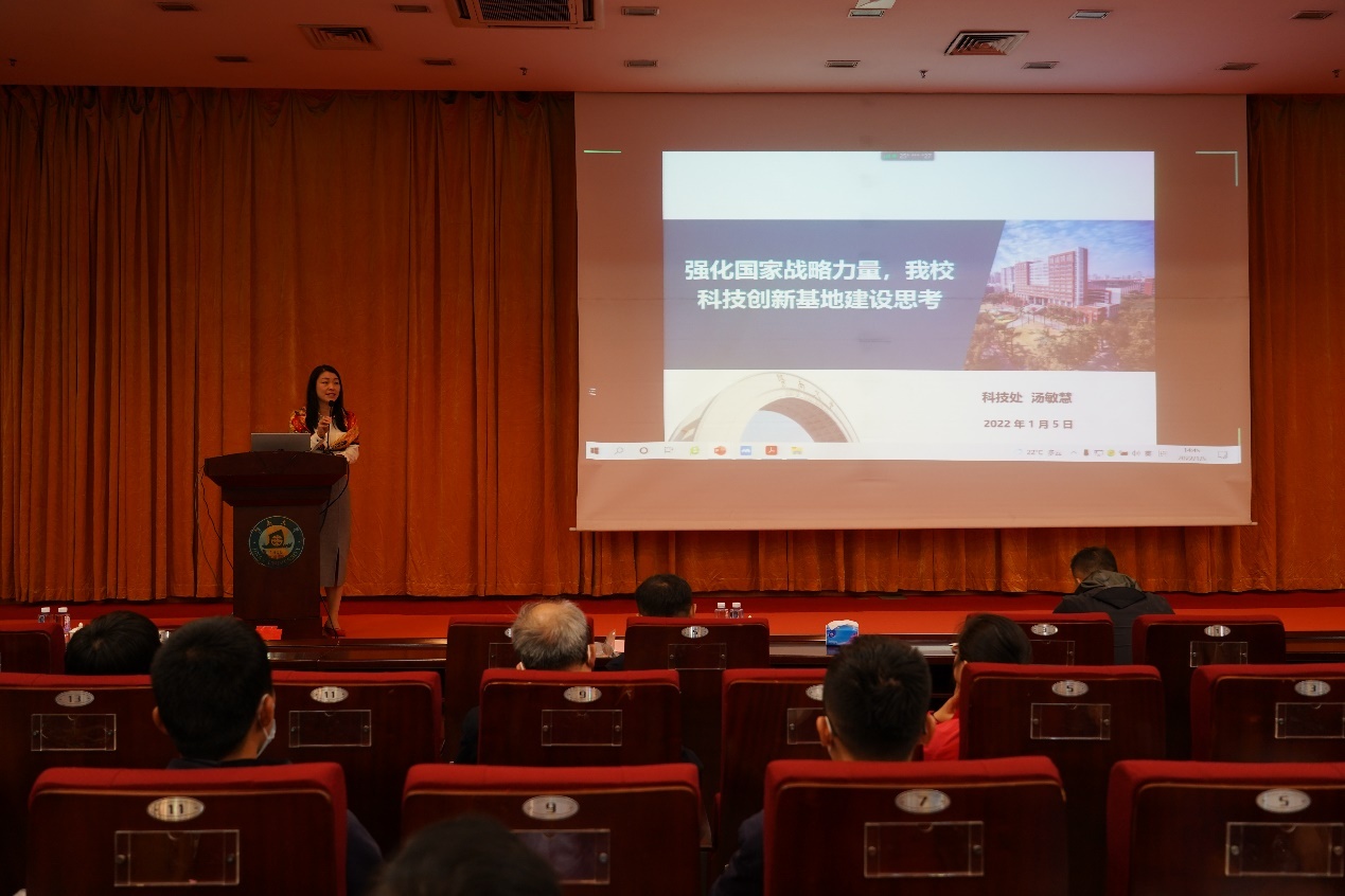在科技创新平台政策宣讲环节,科技处副处长汤敏慧作了《强化国家战略力量,我??萍即葱禄亟ㄉ杷伎肌分魈獗ǜ妗K庸液凸愣≌铰圆忝嫦晗附樯芰丝萍即葱禄靥逑岛驼?,在全面分析我校科技创新基地概况的基础上,对下一步我??萍即葱禄亟ㄉ璺⒄棺鞒隽嗽诙ゲ闵杓撇忝婕忧客吵锊季?、以交叉融合促进协同创新、坚持制度创新先行的思考和建议。