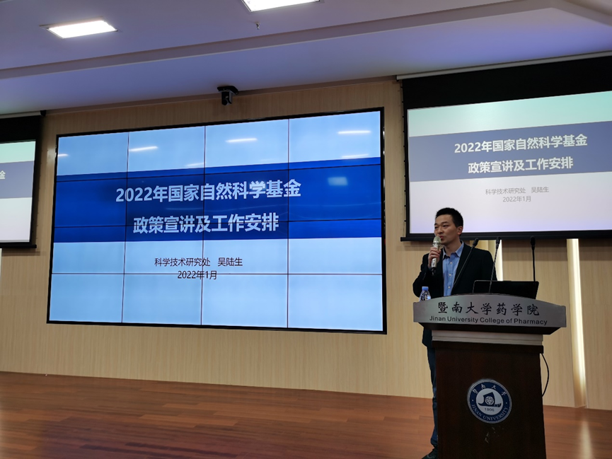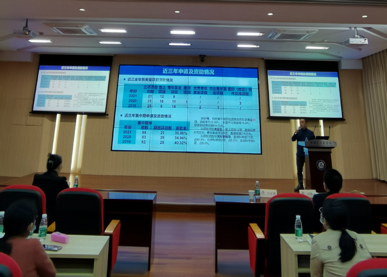 随后,吴陆生副处长做“2022年国家自然科学基金政策宣讲及工作安排”专题报告,报告就四方面进行介绍:一是2021年国家自然科学基金资助分析,总结了2021年我校在国家自然科学基金工作中取得的成绩及亮点;二是2022 年国家自然科学基金申报政策,从资助体系、申请条件规定、限项申请规定、分类评审规定、申请材料规定、预算编制要求、形式审查要求、申请评审流程及政策的变化进行了详细的分享介绍,着重强调了科研诚信的重要性;三是2022年国家自然科学基金申报要点,吴陆生副处长结合药学院的特点详细介绍了2022年国家自然科学基金的申报要点,强调科研人员要从以下方面对申报书进行打磨:凝练科学问题、精选项目名称、打磨项目摘要、优化技术路线、展示前期基础等;四是介绍了学校2022年国家自然科学基金申报工作安排,分享了学校科研管理相关文件及学校的国家自然科学基金支撑政策,鼓励科研人员积极申报项目、主动申报、应报尽报。