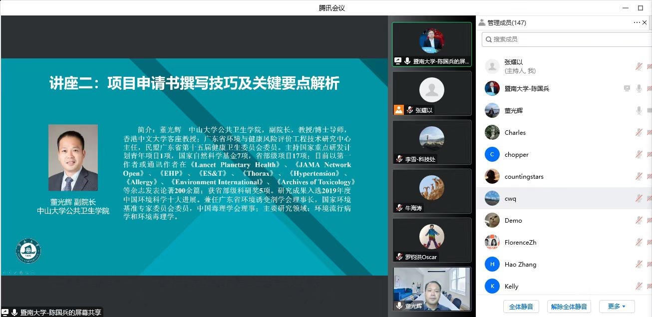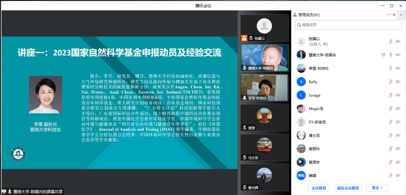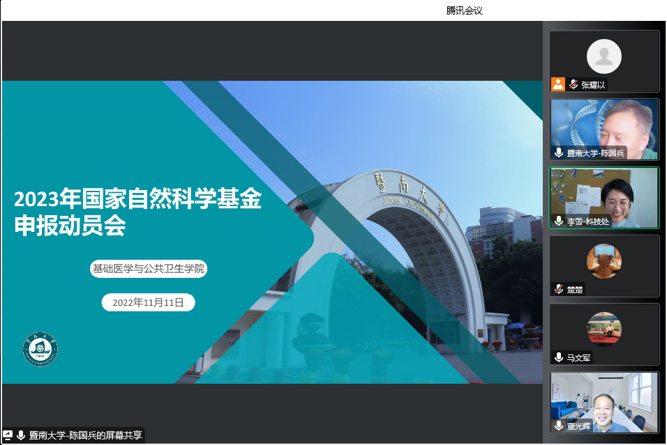 为响应习近平总书记在党的二十大报告中指出“要坚持教育优先发展、科技自立自强、人才引领驱动,加快建设教育强国、科技强国、人才强国”的号召,提升学院学科发展及人才建设水平,基础医学与公共卫生学院于2022年11月11日下午3点召开了2023年国家自然科学基金申报动员会线上会议。本次会议邀请了暨南大学科技处副处长李雪和中山大学公共卫生学院副院长董光辉分别开展主题讲座,会议由基础医学与公共卫生学院副院长陈国兵主持。
