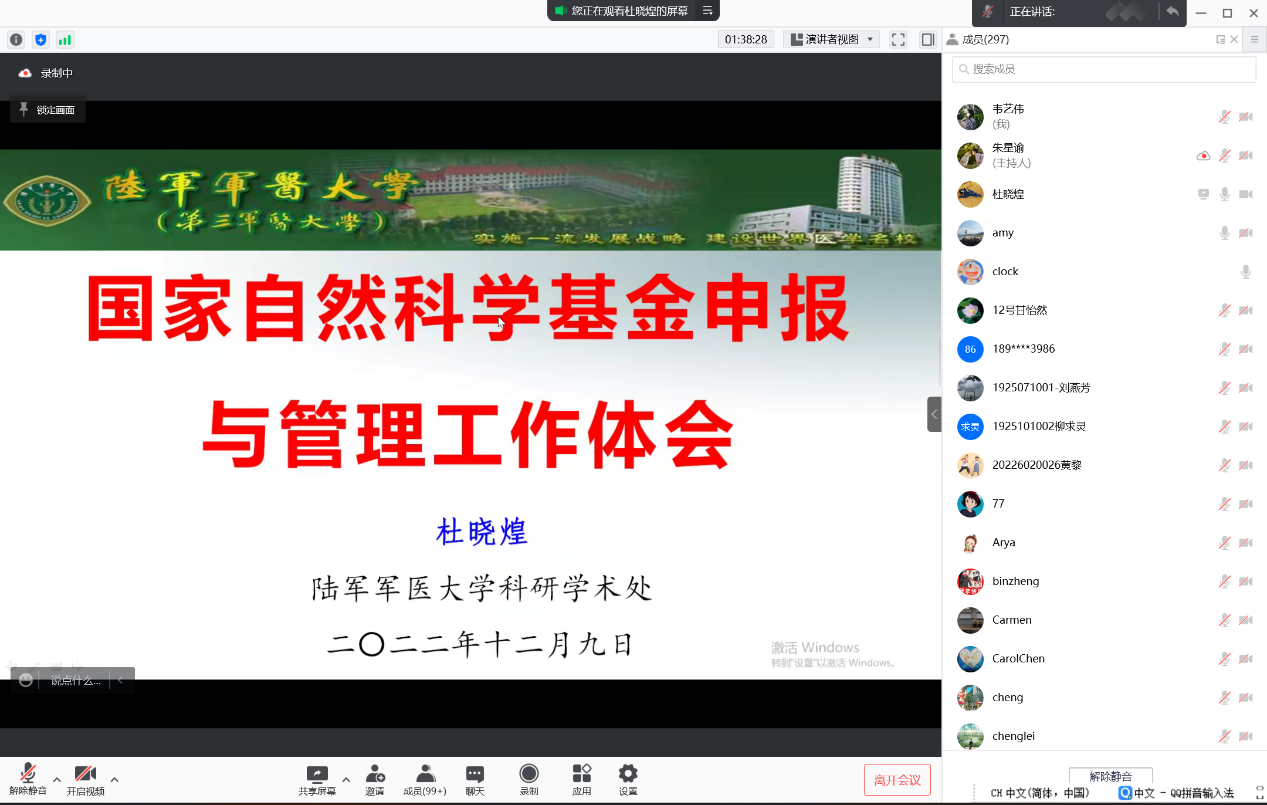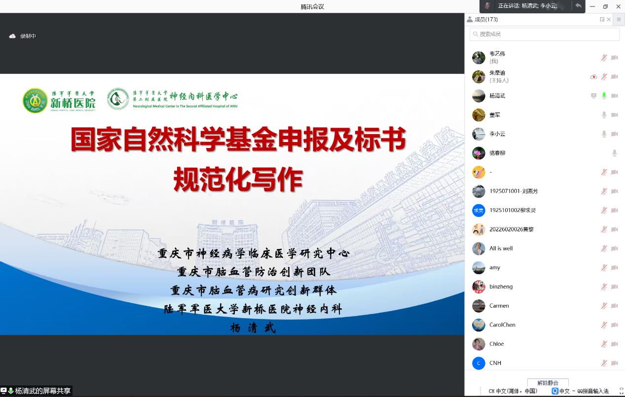 为切实有效推进2023年度国家自然科学基金项目申报工作,帮助科研老师提升国基申报书的撰写质量,12月9日,由科学技术研究处联合医学部以线上视频会议的形式组织开展了2023年度国家自然科学基金申报系列云端讲座——医学部专场。本次讲座特邀陆军(第三)军医大学第二附属医院杨清武教授、中科院昆明动物研究所陈勇彬研究员和陆军军医大学杜晓煌中校作基金申报工作的经验分享。科技处副处长李雪主持会议,医学部各学院及附属医院2023年度基金项目拟申请人、各单位科管人员超300人参会。