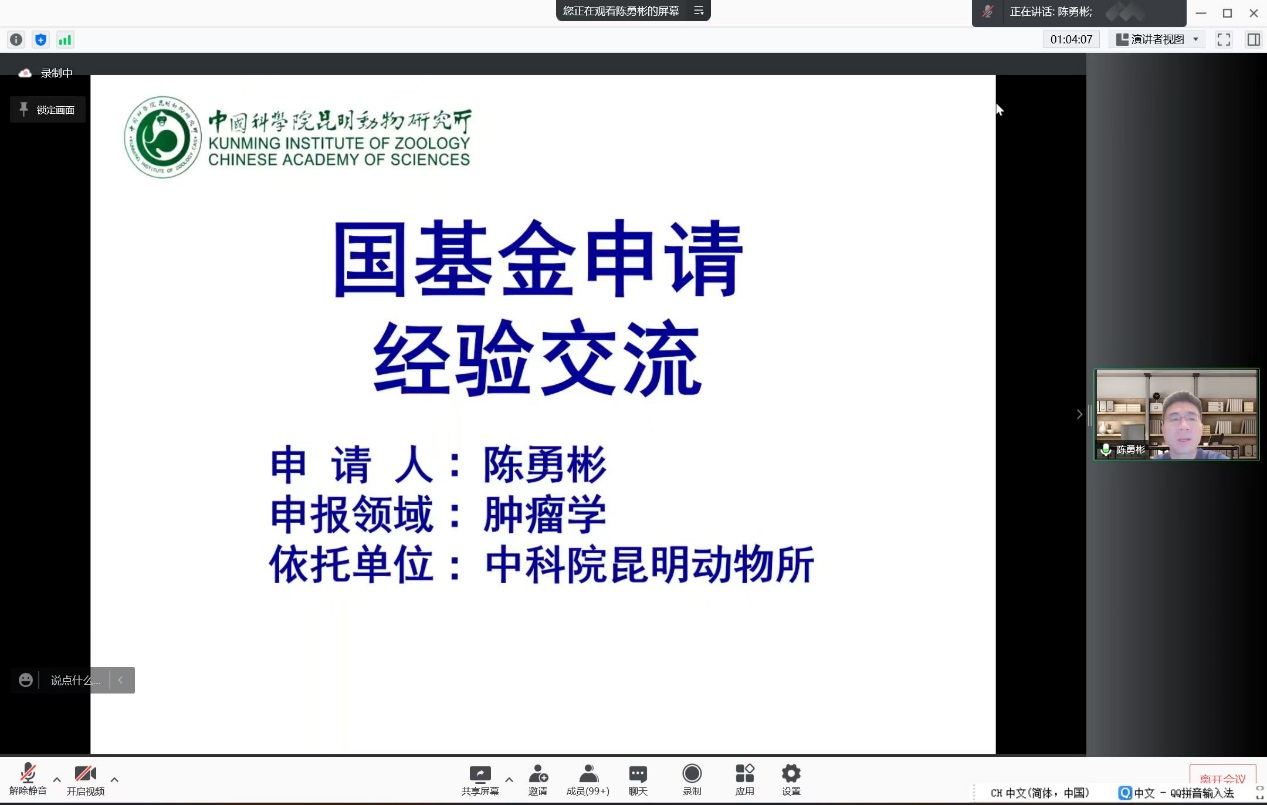 陈勇彬研究员带来了题为《科研探索之我见》的经验分享,他首先对本人的相关研究工作做简要介绍,表示基金申报可以结合地方特色,并以自身申报基金的成功经验展开分享。他强调,基金申报一定要提早准备并不断修改完善,要有不断打磨标书的精神才能最终完成一本优秀的标书。接着,他从课题名称到经费预算,从格式到内容,结合举例说明,深入浅出的对标书的各部分内容的撰写要求和技巧进行分享。最后,他也对基金申报的上会答辩等多方面提出了建议,从评审专家角度解读了申请书中可能存在的普遍问题,并对申请科学基金提出了切实可行的建议。