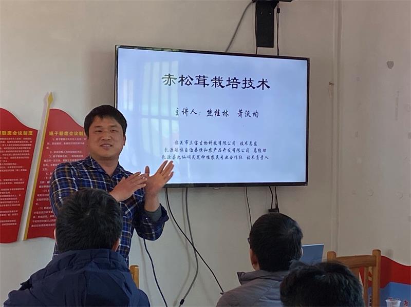 随后,特派员团队相继走访了青迳村、中山村和前洞村,并举行了“大学生创新创业与社会实践基地”和“农村夜校前洞教学点”揭牌仪式。团队与青迳村干部、驻村队员一起进行林下栽培选址,针对青迳、前洞的气候和环境条件,提出因地制宜发展仿野生灵芝栽培,推广赤松茸栽培技术,“变废为宝”增加农业附加值。前洞村支书叶留玉、驻村第一书记邓鹏辉积极发动村民,参加由王在易和熊桂林主讲的《灵芝高产栽培》《赤松茸栽培技术》培训。培训会上,两位主讲人从栽培原理、生产流程、种植前景等进行了详细讲解,语言通俗易懂,培训课程受到村民一致认可;会后,还与村民进行了交流,耐心解答村民的疑惑。
