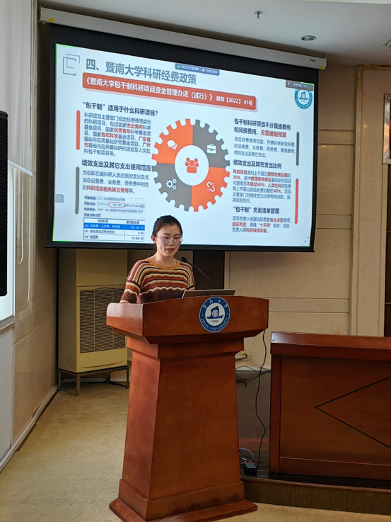 随后,财务处孙晨曦作《“放管服”新政下科研经费管理制度与服务》专题报告。解读了2021年以来中央和省科研经费管理新政策,详细介绍了暨南大学在深化“放管服”改革中具体科研经费政策及相应财务信息化建设情况,并列举经费使用中常见问题,为科研资金使用保驾护航。