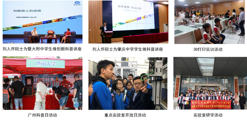 暨南大学力学与3D打印科普教育基地依托暨南大学力学与建筑工程学院和“重大工程灾害与控制”教育部重点实验室,与湖南华曙高科技有限公司、广州纳联材料科技有限公司、广州安世亚太科技有限公司等单位,联合共建有“新型材料设计与增材制造实验中心”。包括“3D打印设计室”和“3D打印实训室”。