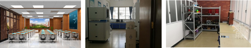 “3D打印设计室”,面积126平米,配备有42套培训桌椅,同时配置戴尔Precision T7820图形工作站42台。“3D打印实训室”面积28+20+20+30平米,配备有华曙高科FS121M金属激光3D打印机、创想三维熔融沉积FDM塑料3D打印机、斯太克X-cube光敏树脂3D打印机、UP BOX+3D融熔堆积塑料3D打印机、精密数控中走丝线切割机床、精密成型平面磨床、株式会社Y-3DR大型智能吸尘器、101-OA电热鼓风烘干机等。